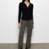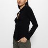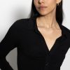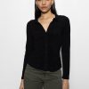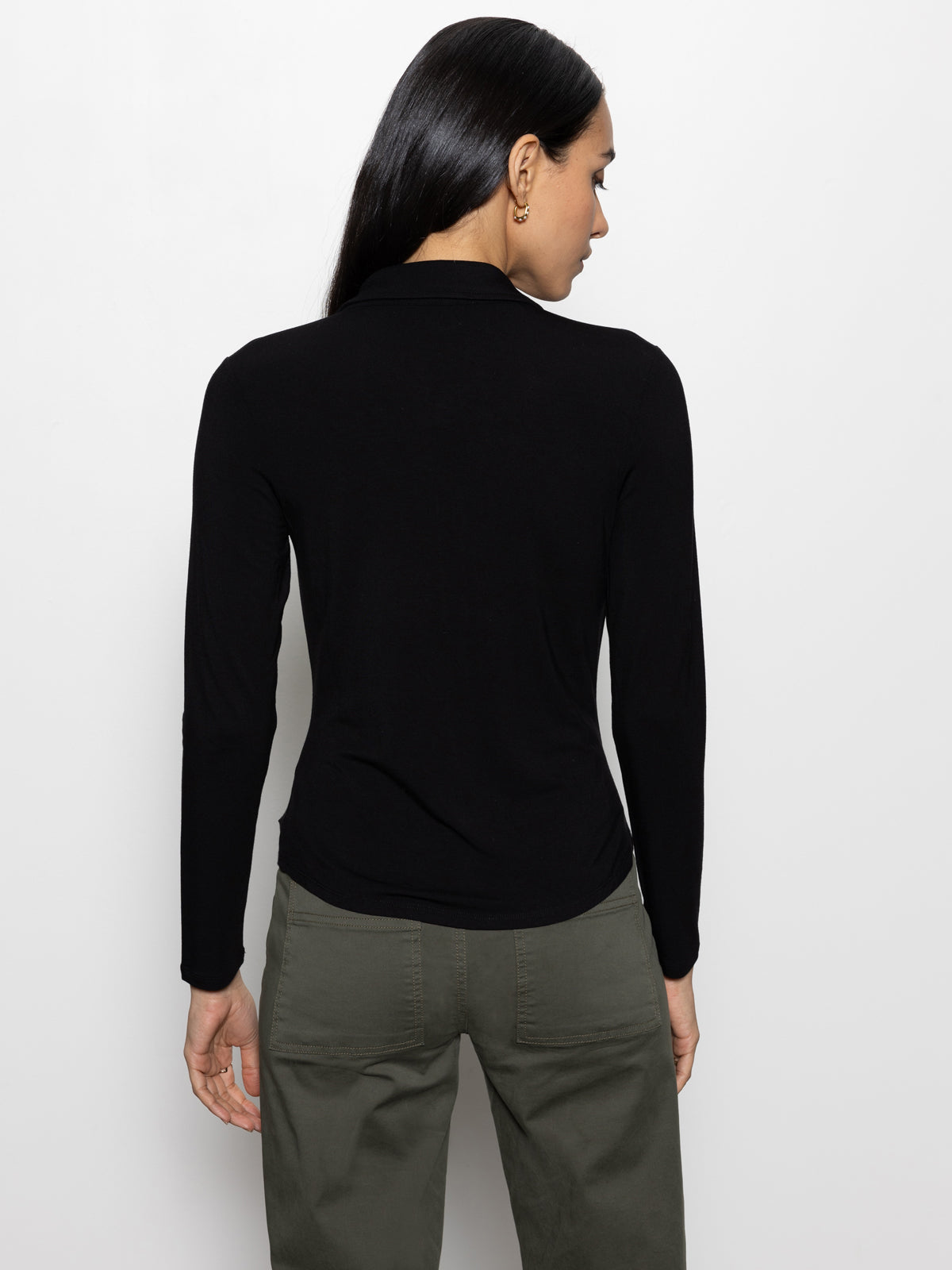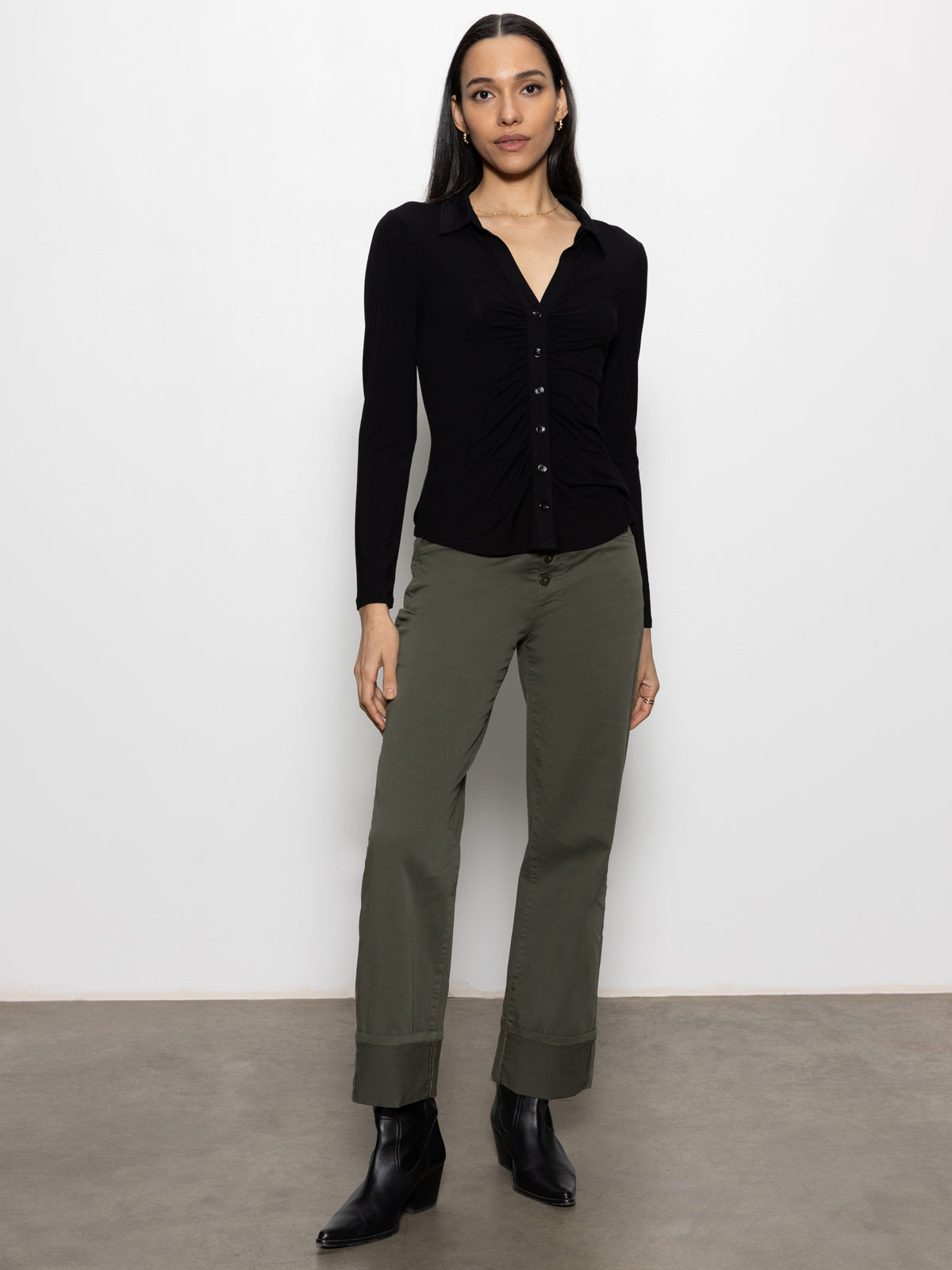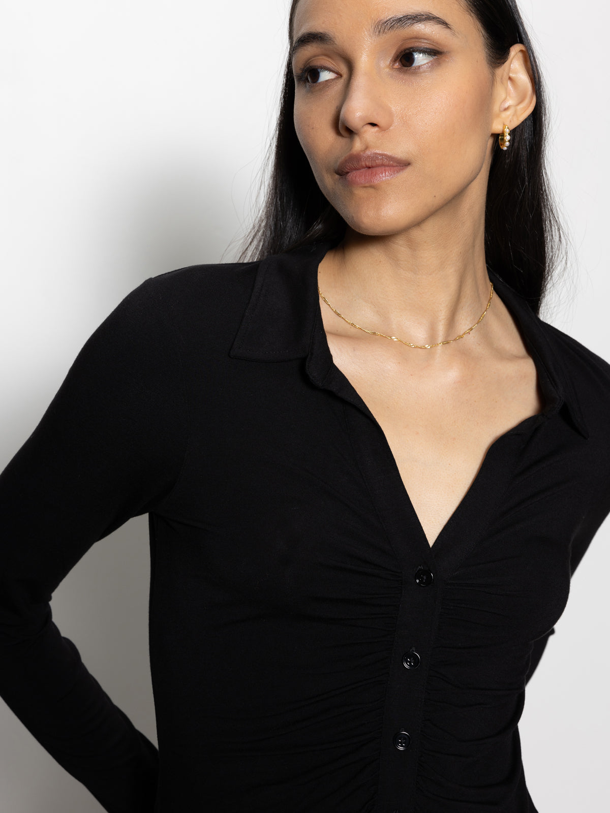 A lightweight slinky knit shapes this slim button-front blouse finished with a deep V and ruched front detail.